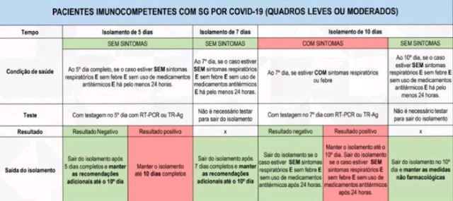 Aqueles que realizarem testagem (RT-PCR ou teste rápido de antígeno) para Covid-19 com resultado negativo no 5º dia, poderão sair do isolamento, antes do prazo de 7 dias, desde que não apresente sintomas respiratórios e febre, há pelo menos 24 horas, e sem o uso de antitérmicos. Se o resultado for positivo, é necessário permanecer em isolamento por 10 dias a contar do início dos sintomas.